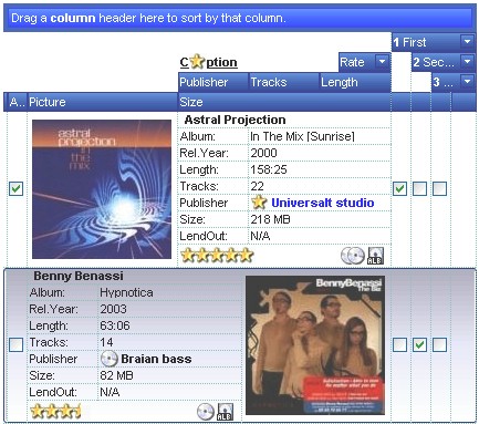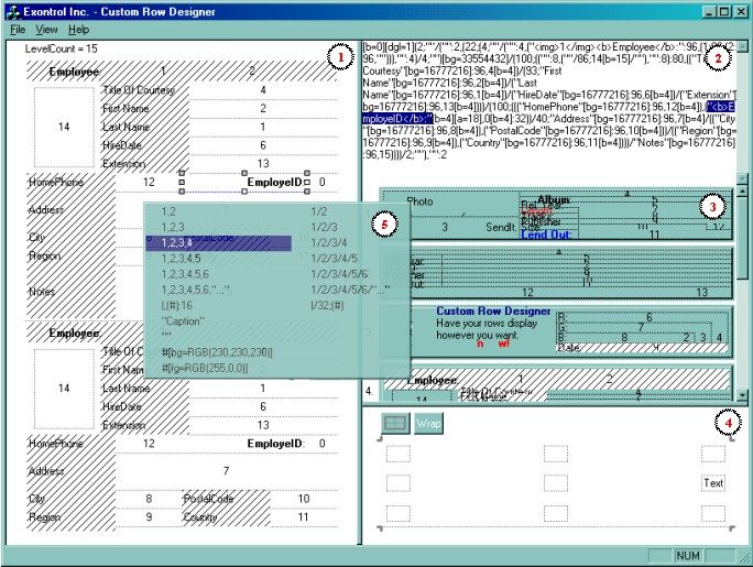 The Exontrol's Custom Row Designer ( exCRD ) is a WYSWYG tool to build new layouts for cells/nodes, items/rows or columns/fields. The exCRD tool generates CRD strings from the layout you built. The syntax of CRD strings is designed to be easy to build, change and read. Using CRD strings is powerful than preformatted card view, group view formats, nested bands, and so on, since you are free to define the full layout of the cell/node, item/row or a column/field.