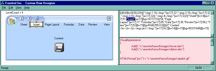 Starting from the version 2.0, the CRD tool includes an Visual-Appearance area to load icons, images, pictures and EBN objects, so the objects in the CRD format may display <img> or <bg> tags. For instance, the <img>1</img> displays the first icon that was previously loaded using the Images or ReplaceIcon method. The <img>pic1</img> displays a custom size picture that was previously loaded using the HTMLPicture property. The [bg=16777216] indicates that the background of the object displays the EBN object with the identifier 1. The 16777216 represents the 0x1RRGGBB, or 0x1000000, where 1 indicates the identifier of the skin object being loaded using the VisualAppearance.Add method.