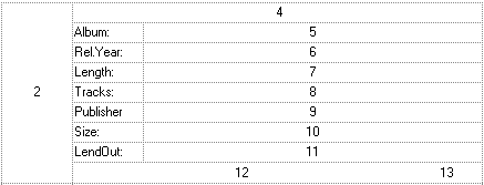 We got: `(""[b=11]/64;3[b=10]/""[b=14]):64,(2/("Album:":96,13)/("RelYear:":96,4)/("Length:":96,5)/("Tracks:":96,6)/ ("Publisher:":96,7)/("Size:":96,8)/("LendOut:":96,9)/(11,12:48))`
