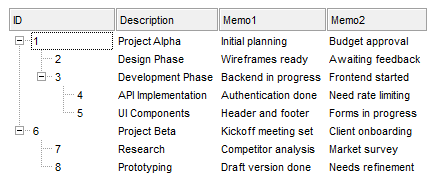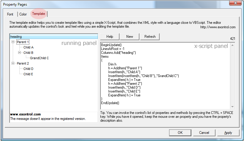 The user can display the list of methods and properties of the control by pressing the CTRL + SPACE key, in the Template's editor. Let's say that we have the exTree's Template page displayed. For instance, the following sample is a Template script that adds few columns and items to an exTree control: